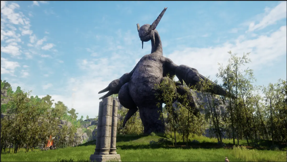 Having now journeyed far from where I first drifted ashore, I have come across a massive statue in the shape of a Pal.
